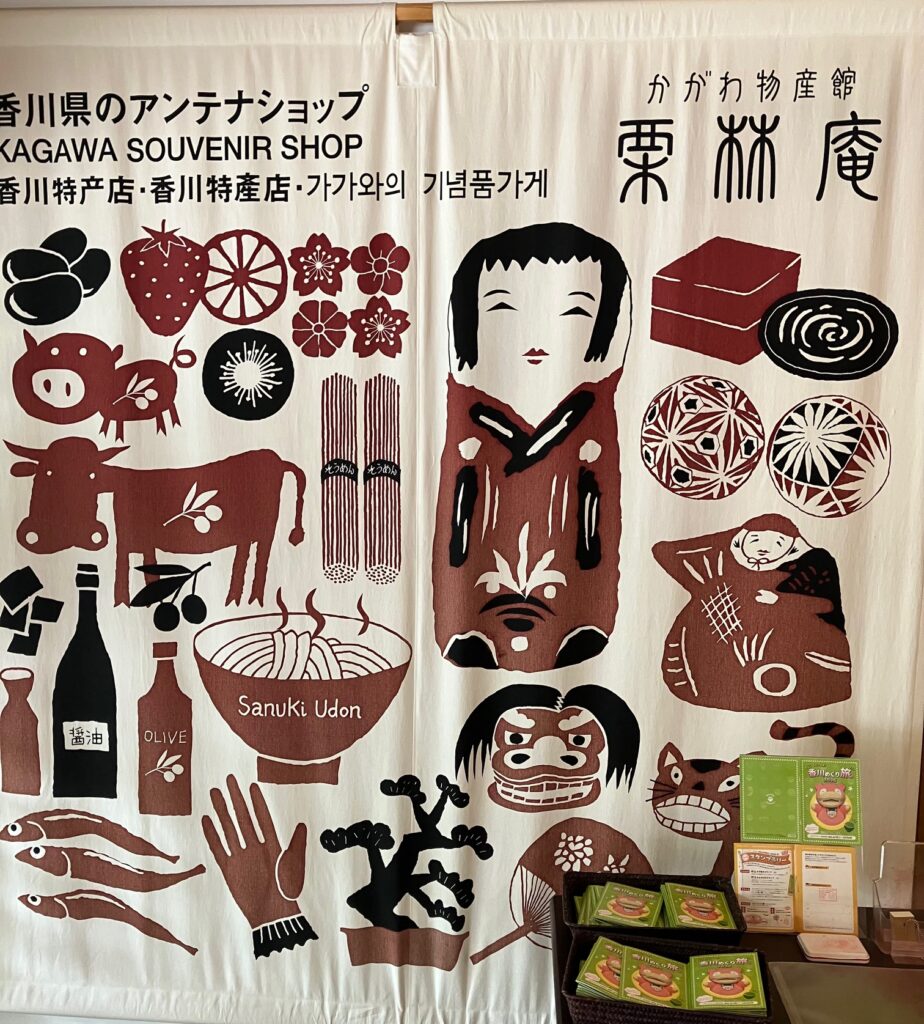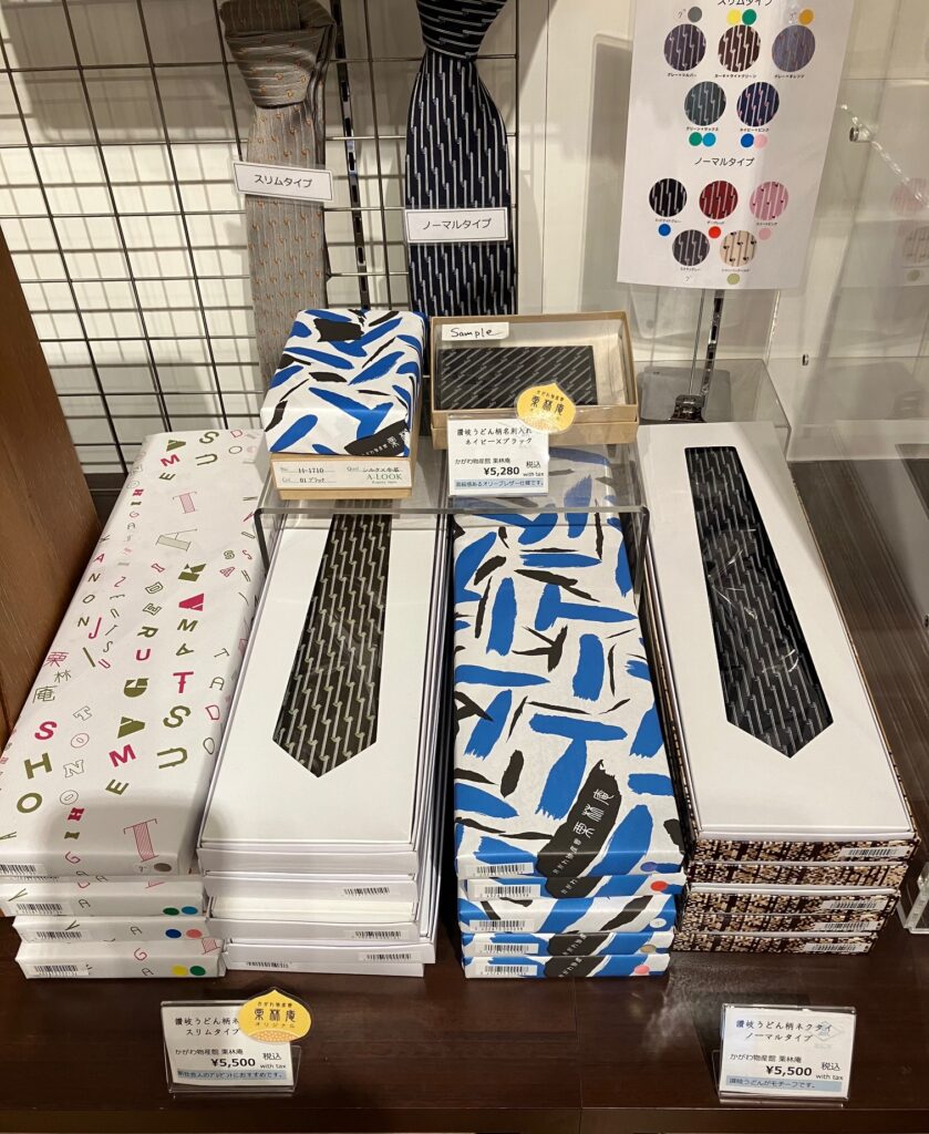 今回、卸支店長栄転祝いとして栗林公園のお土産屋さん栗林庵にうどん柄ネクタイ買いに行きました!いつも餞別やお祝いにネクタイ&(親しみ度に合わせて(笑))多度津の名産品の靴底インソールの「SOKO」とオリーブ「蒼のダイヤ」の3点セット送ります!次のステージの話題になれば嬉しいです!